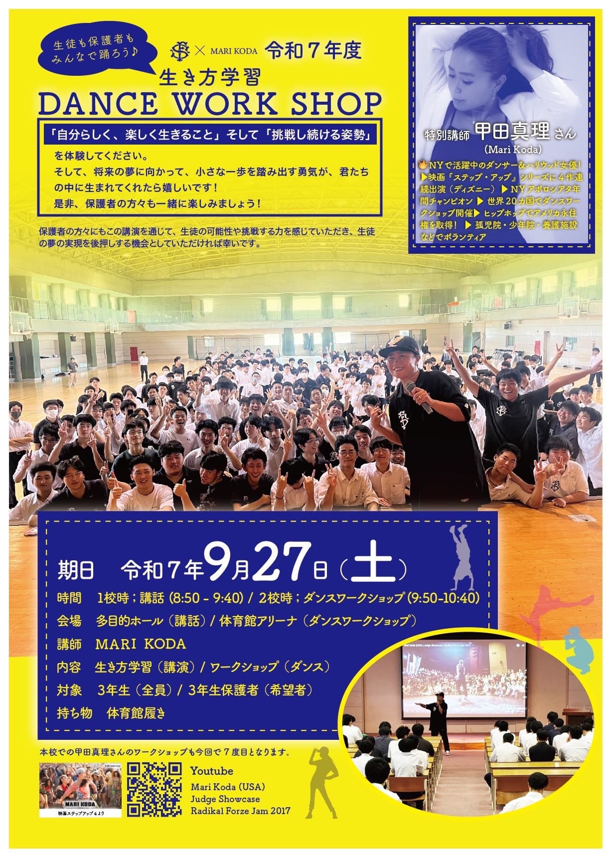 本校では毎年、3年生を対象に「生き方学習・ダンスワークショップ」を実施しており、今年度も講師として 甲田真理(MARI KODA)様 をお招きいたします。