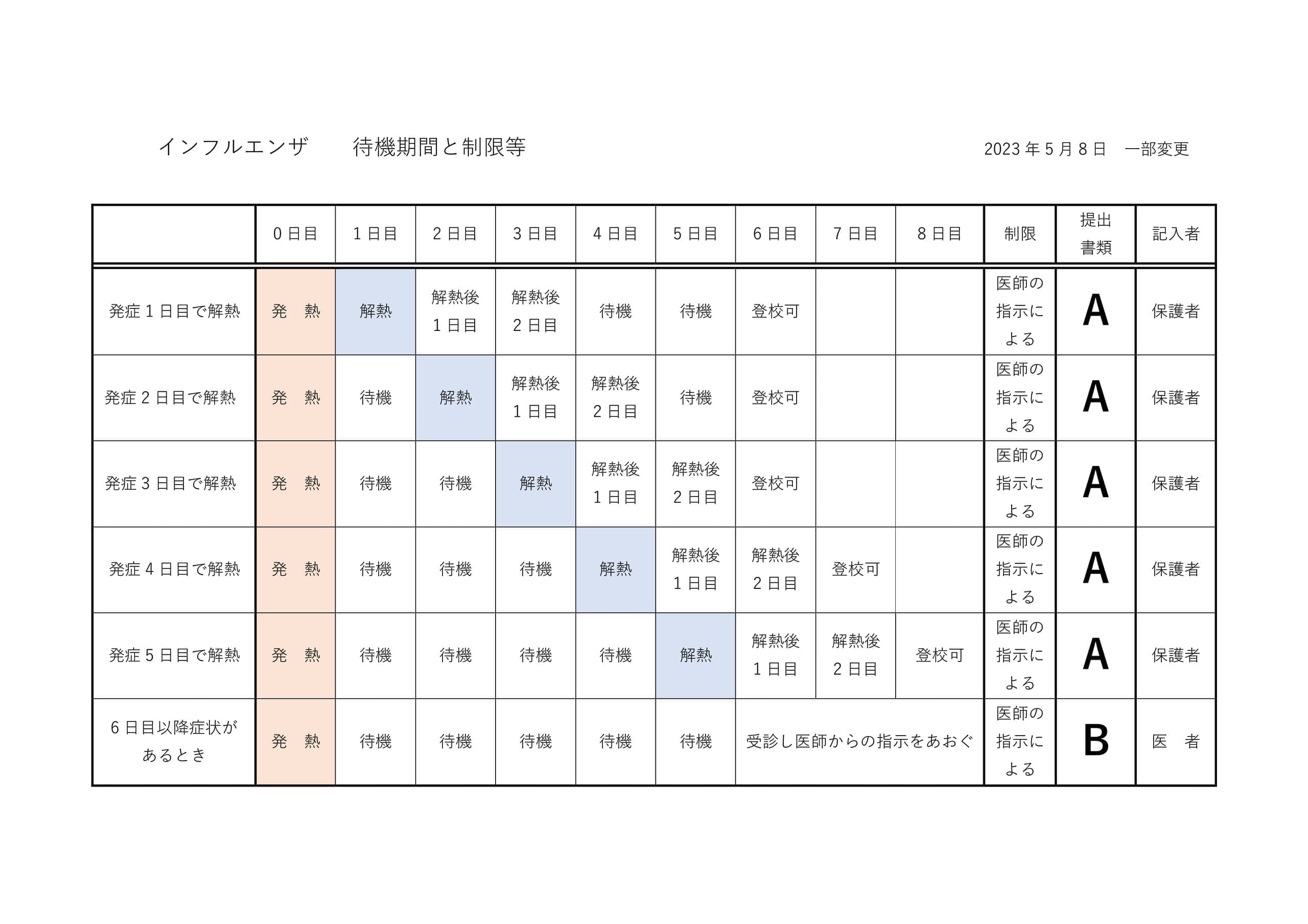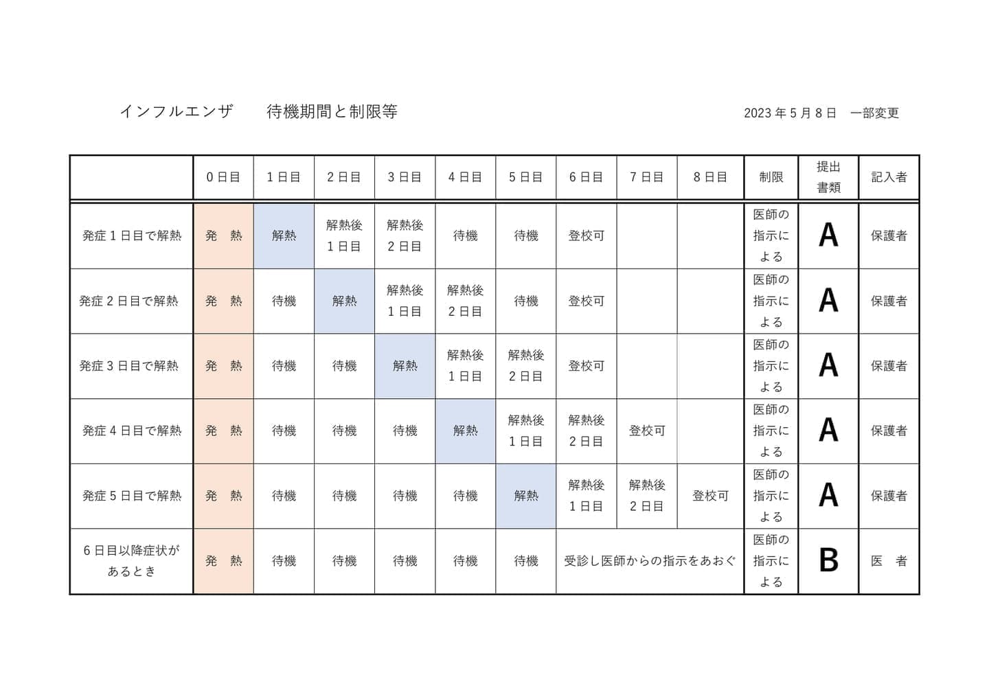 2023年5月8日より学校保健安全法施行規則の一部が改正され、下の表のとおりとなりました。変更点といたしましては「新型コロナウイルス感染症」が第2種に追加されたことと、出席停止期間の基準です。すでに配付されております「入学のしおり」の記載内容から変更となっておりますのでご注意ください。