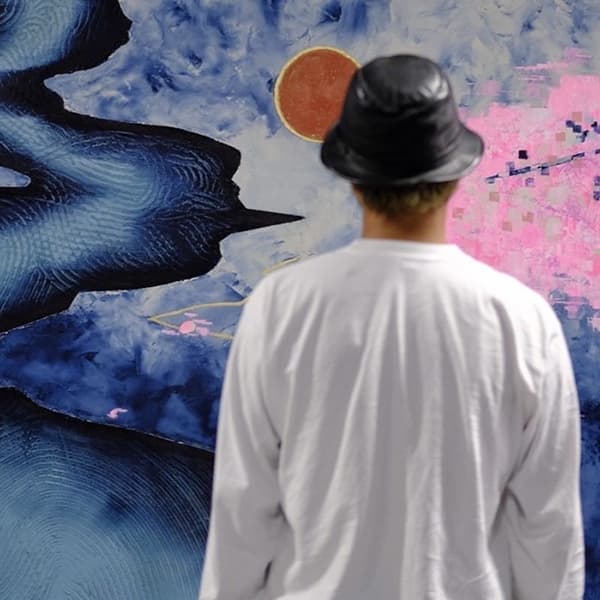 本校の卒業生で、現在まなびのOS科/表現/藍染の授業を担当。独自の技法でアート制作や建築を行う。独学が故、常識にとらわれない作風は多くのファンを持ち、著名人の個人邸宅や有名ブランドの店舗デザインにも起用される。遠い記憶へと繋がる、奥深い藍色の壁面。鑑賞者の美しい思い出を呼び覚ます、青の表現者。