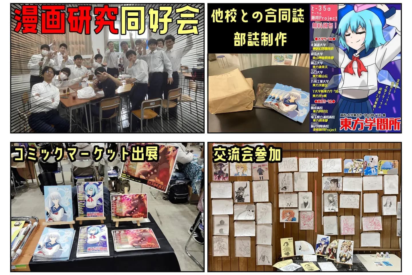 絵画、イラスト班絵画チームは市や県の高校美術展などに出展。イラスト班は漫研と一緒にコミケに出展するなど活発に活動しています。