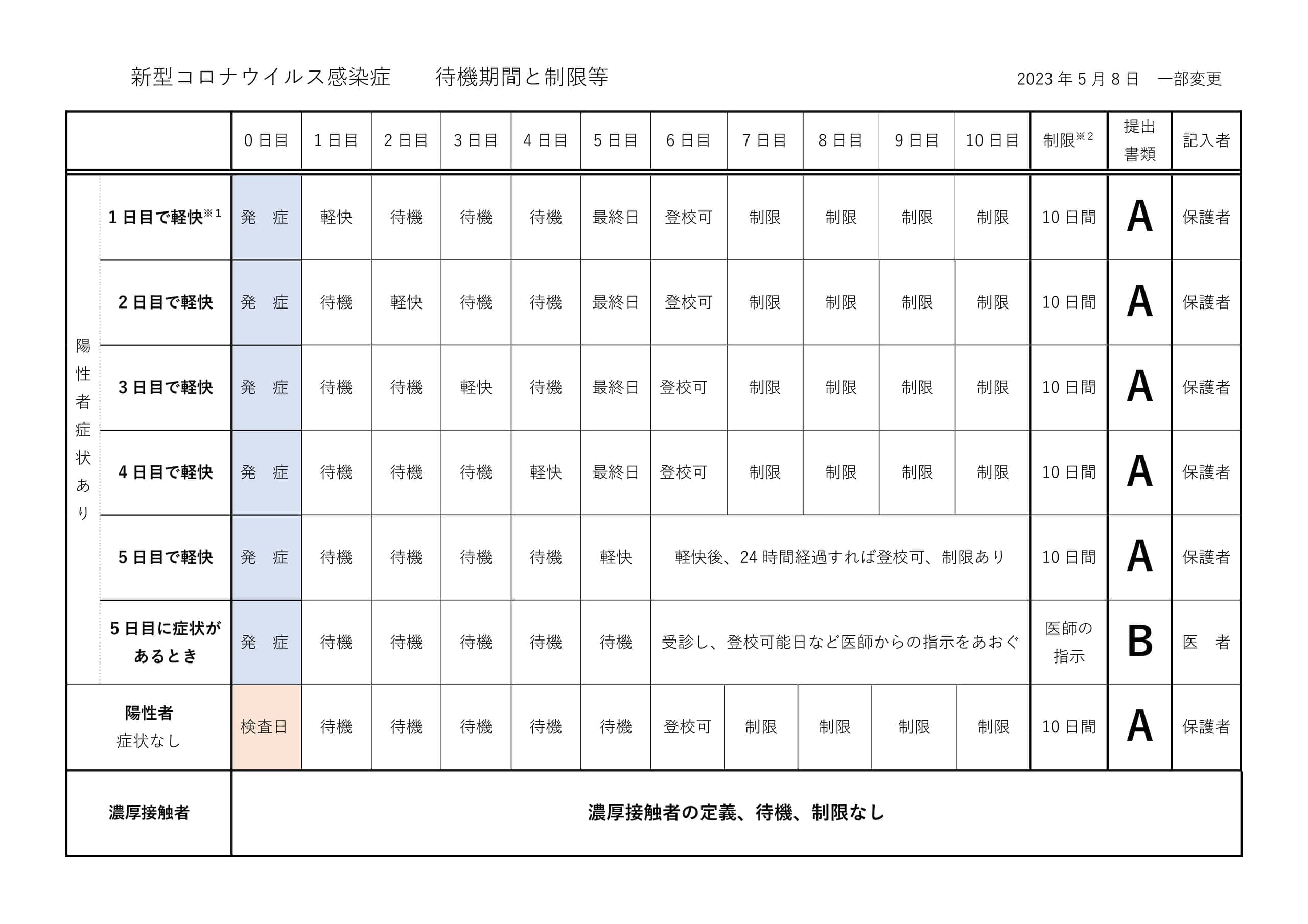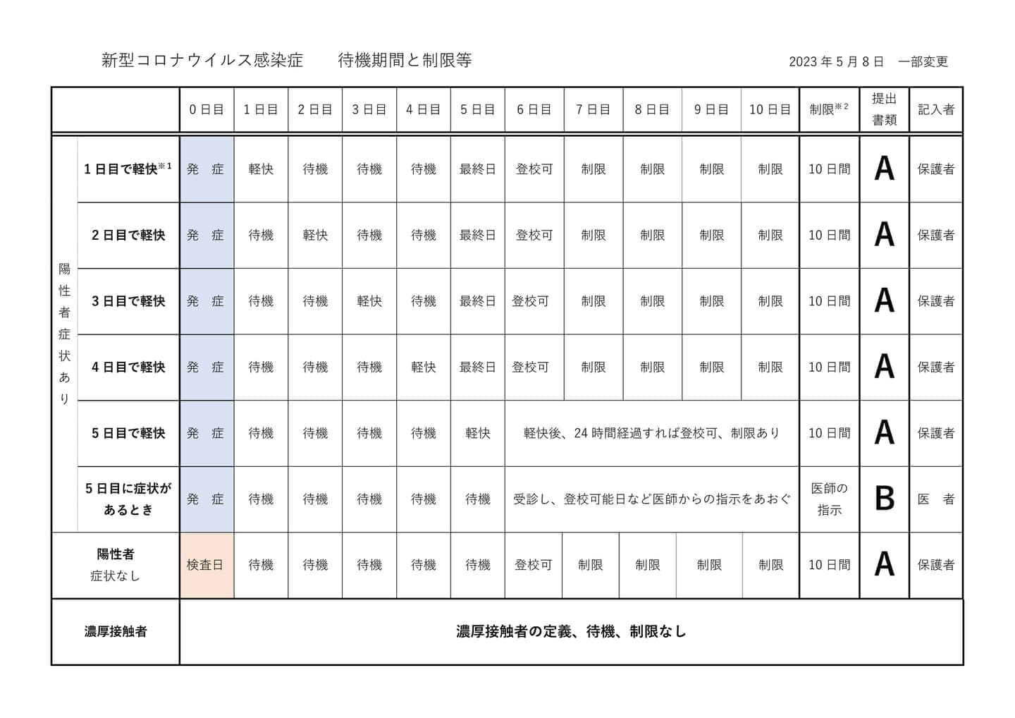 2023年5月8日より学校保健安全法施行規則の一部が改正され、下の表のとおりとなりました。変更点といたしましては「新型コロナウイルス感染症」が第2種に追加されたことと、出席停止期間の基準です。すでに配付されております「入学のしおり」の記載内容から変更となっておりますのでご注意ください。