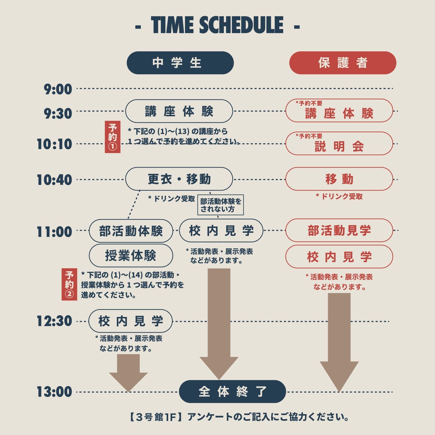 *必ず保護者の方の同意をもとに、【中学生対象】講座体験・【中学生対象】 部活動体験・授業体験・【保護者様対象】学校説明会・【中学生・保護者様対象】学校見学ツアー の4つのカテゴリーから各リンクより予約をしてください。